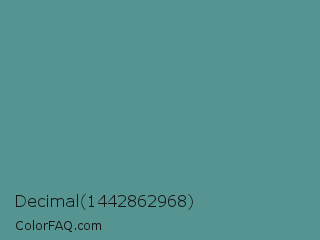 Decimal 1442862968 Color is a normal cyan color and the nearest color is Patina #639a8f. Hex code #569492 and RGB value is rgb(86,148,146). In RGB color space, this color is composed of 34% red, 58% green, 57% blue, In CMYK color space, this color is composed of 42% cyan, 0% magenta, 1% yellow , 42% black , In HSL color space, this color has a hue angle of 178° , 26% saturation and 46% lightness.