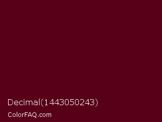 Decimal 1443050243 Color is a very dark rose color and the nearest color is Dark Scarlet #560319. Hex code #570017 and RGB value is rgb(87,0,23). In RGB color space, this color is composed of 34% red, 0% green, 9% blue, In CMYK color space, this color is composed of 0% cyan, 100% magenta, 74% yellow , 66% black , In HSL color space, this color has a hue angle of 344° , 100% saturation and 17% lightness.