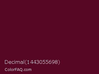 Decimal 1443055698 Color is a very dark rose color and the nearest color is Bordeaux #5c0120. Hex code #570624 and RGB value is rgb(87,6,36). In RGB color space, this color is composed of 34% red, 2% green, 14% blue, In CMYK color space, this color is composed of 0% cyan, 93% magenta, 59% yellow , 66% black , In HSL color space, this color has a hue angle of 338° , 87% saturation and 18% lightness.
