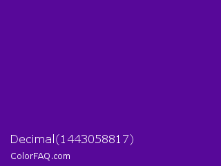Decimal 1443058817 Color is a normal purple color and the nearest color is Purple #660099. Hex code #570899 and RGB value is rgb(87,8,153). In RGB color space, this color is composed of 34% red, 3% green, 60% blue, In CMYK color space, this color is composed of 43% cyan, 95% magenta, 0% yellow , 40% black , In HSL color space, this color has a hue angle of 273° , 90% saturation and 32% lightness.