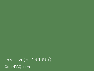 Decimal 90194995 Color is a normal green color and the nearest color is Hippie Green #53824b. Hex code #558451 and RGB value is rgb(85,132,81). In RGB color space, this color is composed of 33% red, 52% green, 32% blue, In CMYK color space, this color is composed of 36% cyan, 0% magenta, 39% yellow , 48% black , In HSL color space, this color has a hue angle of 115° , 24% saturation and 42% lightness.