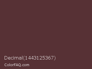 Decimal 1443125367 Color is a dark red color and the nearest color is Congo Brown #593737. Hex code #573135 and RGB value is rgb(87,49,53). In RGB color space, this color is composed of 34% red, 19% green, 21% blue, In CMYK color space, this color is composed of 0% cyan, 44% magenta, 39% yellow , 66% black , In HSL color space, this color has a hue angle of 354° , 28% saturation and 27% lightness.