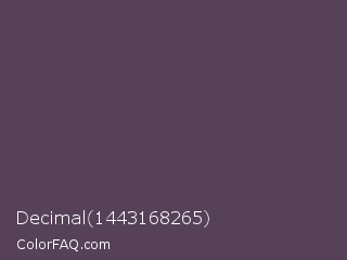 Decimal 1443168265 Color is a dark magenta color and the nearest color is English Violet #563c5c. Hex code #574159 and RGB value is rgb(87,65,89). In RGB color space, this color is composed of 34% red, 25% green, 35% blue, In CMYK color space, this color is composed of 2% cyan, 27% magenta, 0% yellow , 65% black , In HSL color space, this color has a hue angle of 295° , 16% saturation and 30% lightness.