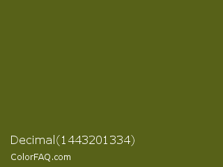 Decimal 1443201334 Color is a dark yellow color and the nearest color is Saratoga #555b10. Hex code #576118 and RGB value is rgb(87,97,24). In RGB color space, this color is composed of 34% red, 38% green, 9% blue, In CMYK color space, this color is composed of 10% cyan, 0% magenta, 75% yellow , 62% black , In HSL color space, this color has a hue angle of 68° , 60% saturation and 24% lightness.