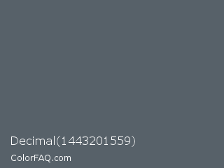 Decimal 1443201559 Color is a normal blue color and the nearest color is Black Coral #54626f. Hex code #576169 and RGB value is rgb(87,97,105). In RGB color space, this color is composed of 34% red, 38% green, 41% blue, In CMYK color space, this color is composed of 17% cyan, 8% magenta, 0% yellow , 59% black , In HSL color space, this color has a hue angle of 207° , 9% saturation and 38% lightness.