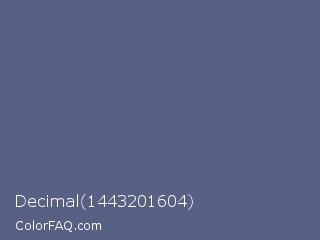 Decimal 1443201604 Color is a normal blue color and the nearest color is Paynes Grey #536878. Hex code #576184 and RGB value is rgb(87,97,132). In RGB color space, this color is composed of 34% red, 38% green, 52% blue, In CMYK color space, this color is composed of 34% cyan, 27% magenta, 0% yellow , 48% black , In HSL color space, this color has a hue angle of 227° , 21% saturation and 43% lightness.
