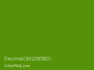 Decimal 90208580 Color is a dark green color and the nearest color is Avocado #568203. Hex code #559208 and RGB value is rgb(85,146,8). In RGB color space, this color is composed of 33% red, 57% green, 3% blue, In CMYK color space, this color is composed of 42% cyan, 0% magenta, 95% yellow , 43% black , In HSL color space, this color has a hue angle of 87° , 90% saturation and 30% lightness.