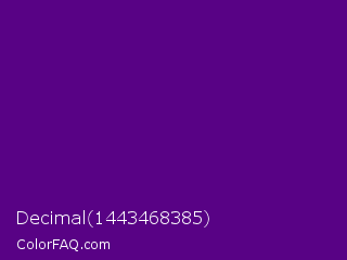 Decimal 1443468385 Color is a dark purple color and the nearest color is Pigment Indigo #4b0082. Hex code #580285 and RGB value is rgb(88,2,133). In RGB color space, this color is composed of 35% red, 1% green, 52% blue, In CMYK color space, this color is composed of 34% cyan, 98% magenta, 0% yellow , 48% black , In HSL color space, this color has a hue angle of 279° , 97% saturation and 26% lightness.