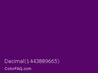 Decimal 1443889665 Color is a very dark purple color and the nearest color is Clairvoyant #480656. Hex code #580569 and RGB value is rgb(88,5,105). In RGB color space, this color is composed of 35% red, 2% green, 41% blue, In CMYK color space, this color is composed of 16% cyan, 95% magenta, 0% yellow , 59% black , In HSL color space, this color has a hue angle of 290° , 91% saturation and 22% lightness.