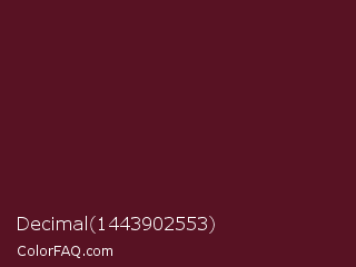 Decimal 1443902553 Color is a very dark red color and the nearest color is Maroon Oak #520c17. Hex code #581223 and RGB value is rgb(88,18,35). In RGB color space, this color is composed of 35% red, 7% green, 14% blue, In CMYK color space, this color is composed of 0% cyan, 80% magenta, 60% yellow , 65% black , In HSL color space, this color has a hue angle of 345° , 66% saturation and 21% lightness.