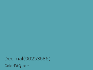 Decimal 90253686 Color is a normal cyan color and the nearest color is Hippie Blue #589aaf. Hex code #55a5b0 and RGB value is rgb(85,165,176). In RGB color space, this color is composed of 33% red, 65% green, 69% blue, In CMYK color space, this color is composed of 52% cyan, 6% magenta, 0% yellow , 31% black , In HSL color space, this color has a hue angle of 187° , 37% saturation and 51% lightness.