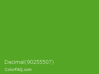 Decimal 90255507 Color is a normal green color and the nearest color is Green RYB #66b032. Hex code #55a625 and RGB value is rgb(85,166,37). In RGB color space, this color is composed of 33% red, 65% green, 15% blue, In CMYK color space, this color is composed of 49% cyan, 0% magenta, 78% yellow , 35% black , In HSL color space, this color has a hue angle of 98° , 64% saturation and 40% lightness.
