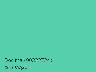 Decimal 90322724 Color is a normal green color and the nearest color is Eucalyptus #44d7a8. Hex code #55cfac and RGB value is rgb(85,207,172). In RGB color space, this color is composed of 33% red, 81% green, 67% blue, In CMYK color space, this color is composed of 59% cyan, 0% magenta, 17% yellow , 19% black , In HSL color space, this color has a hue angle of 163° , 56% saturation and 57% lightness.