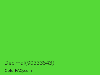 Decimal 90333543 Color is a normal green color and the nearest color is Harlequin Green #46cb18. Hex code #55d937 and RGB value is rgb(85,217,55). In RGB color space, this color is composed of 33% red, 85% green, 22% blue, In CMYK color space, this color is composed of 61% cyan, 0% magenta, 75% yellow , 15% black , In HSL color space, this color has a hue angle of 109° , 68% saturation and 53% lightness.