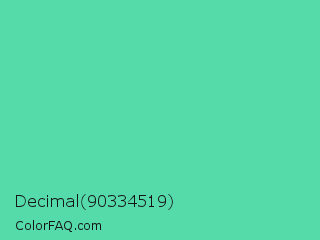 Decimal 90334519 Color is a normal green color and the nearest color is Medium Aquamarine #66ddaa. Hex code #55daa9 and RGB value is rgb(85,218,169). In RGB color space, this color is composed of 33% red, 85% green, 66% blue, In CMYK color space, this color is composed of 61% cyan, 0% magenta, 22% yellow , 15% black , In HSL color space, this color has a hue angle of 158° , 64% saturation and 59% lightness.