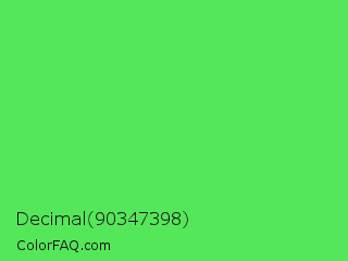 Decimal 90347398 Color is a light green color and the nearest color is Screamin Green #66ff66. Hex code #55e75a and RGB value is rgb(85,231,90). In RGB color space, this color is composed of 33% red, 91% green, 35% blue, In CMYK color space, this color is composed of 63% cyan, 0% magenta, 61% yellow , 9% black , In HSL color space, this color has a hue angle of 122° , 75% saturation and 62% lightness.