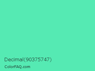 Decimal 90375747 Color is a light green color and the nearest color is Medium Aquamarine #66ddaa. Hex code #55eab3 and RGB value is rgb(85,234,179). In RGB color space, this color is composed of 33% red, 92% green, 70% blue, In CMYK color space, this color is composed of 64% cyan, 0% magenta, 24% yellow , 8% black , In HSL color space, this color has a hue angle of 158° , 78% saturation and 63% lightness.