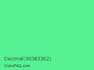 Decimal 90383362 Color is a light green color and the nearest color is Very Light Malachite Green #64e986. Hex code #55f192 and RGB value is rgb(85,241,146). In RGB color space, this color is composed of 33% red, 95% green, 57% blue, In CMYK color space, this color is composed of 65% cyan, 0% magenta, 39% yellow , 5% black , In HSL color space, this color has a hue angle of 143° , 85% saturation and 64% lightness.