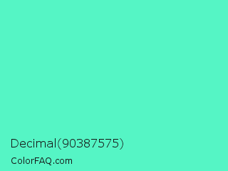 Decimal 90387575 Color is a light green color and the nearest color is Turquoise #40e0d0. Hex code #55f5c5 and RGB value is rgb(85,245,197). In RGB color space, this color is composed of 33% red, 96% green, 77% blue, In CMYK color space, this color is composed of 65% cyan, 0% magenta, 20% yellow , 4% black , In HSL color space, this color has a hue angle of 162° , 89% saturation and 65% lightness.