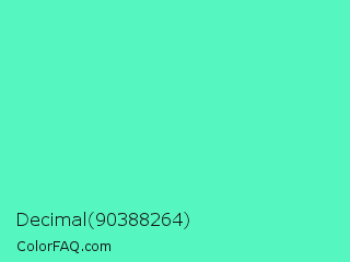 Decimal 90388264 Color is a light green color and the nearest color is Turquoise #40e0d0. Hex code #55f6c0 and RGB value is rgb(85,246,192). In RGB color space, this color is composed of 33% red, 96% green, 75% blue, In CMYK color space, this color is composed of 65% cyan, 0% magenta, 22% yellow , 4% black , In HSL color space, this color has a hue angle of 160° , 90% saturation and 65% lightness.