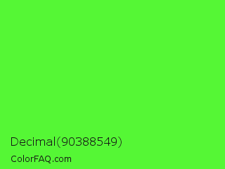 Decimal 90388549 Color is a normal green color and the nearest color is Neon Green #39ff14. Hex code #55f735 and RGB value is rgb(85,247,53). In RGB color space, this color is composed of 33% red, 97% green, 21% blue, In CMYK color space, this color is composed of 66% cyan, 0% magenta, 79% yellow , 3% black , In HSL color space, this color has a hue angle of 110° , 92% saturation and 59% lightness.