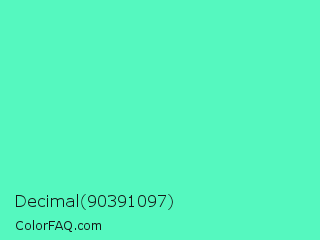 Decimal 90391097 Color is a light green color and the nearest color is Turquoise #40e0d0. Hex code #55f8bf and RGB value is rgb(85,248,191). In RGB color space, this color is composed of 33% red, 97% green, 75% blue, In CMYK color space, this color is composed of 66% cyan, 0% magenta, 23% yellow , 3% black , In HSL color space, this color has a hue angle of 159° , 92% saturation and 65% lightness.