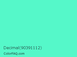 Decimal 90391112 Color is a light green color and the nearest color is Turquoise #40e0d0. Hex code #55f8c8 and RGB value is rgb(85,248,200). In RGB color space, this color is composed of 33% red, 97% green, 78% blue, In CMYK color space, this color is composed of 66% cyan, 0% magenta, 19% yellow , 3% black , In HSL color space, this color has a hue angle of 162° , 92% saturation and 65% lightness.