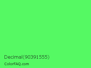 Decimal 90391555 Color is a light green color and the nearest color is Screamin Green #66ff66. Hex code #55f963 and RGB value is rgb(85,249,99). In RGB color space, this color is composed of 33% red, 98% green, 39% blue, In CMYK color space, this color is composed of 66% cyan, 0% magenta, 60% yellow , 2% black , In HSL color space, this color has a hue angle of 125° , 93% saturation and 65% lightness.