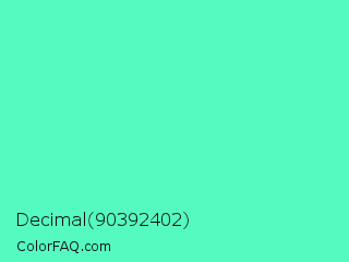 Decimal 90392402 Color is a light green color and the nearest color is Turquoise #40e0d0. Hex code #55fac0 and RGB value is rgb(85,250,192). In RGB color space, this color is composed of 33% red, 98% green, 75% blue, In CMYK color space, this color is composed of 66% cyan, 0% magenta, 23% yellow , 2% black , In HSL color space, this color has a hue angle of 159° , 94% saturation and 66% lightness.