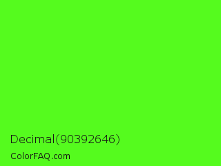 Decimal 90392646 Color is a normal green color and the nearest color is Neon Green #39ff14. Hex code #55fb1e and RGB value is rgb(85,251,30). In RGB color space, this color is composed of 33% red, 98% green, 12% blue, In CMYK color space, this color is composed of 66% cyan, 0% magenta, 88% yellow , 2% black , In HSL color space, this color has a hue angle of 105° , 97% saturation and 55% lightness.