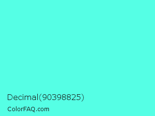 Decimal 90398825 Color is a light cyan color and the nearest color is Turquoise #40e0d0. Hex code #55ffe5 and RGB value is rgb(85,255,229). In RGB color space, this color is composed of 33% red, 100% green, 90% blue, In CMYK color space, this color is composed of 67% cyan, 0% magenta, 10% yellow , 0% black , In HSL color space, this color has a hue angle of 171° , 100% saturation and 67% lightness.