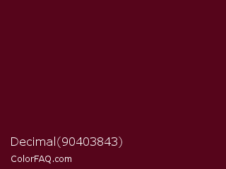 Decimal 90403843 Color is a very dark rose color and the nearest color is Dark Scarlet #560319. Hex code #56051b and RGB value is rgb(86,5,27). In RGB color space, this color is composed of 34% red, 2% green, 11% blue, In CMYK color space, this color is composed of 0% cyan, 94% magenta, 69% yellow , 66% black , In HSL color space, this color has a hue angle of 344° , 89% saturation and 18% lightness.