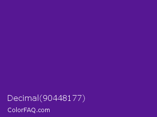 Decimal 90448177 Color is a normal violet color and the nearest color is Daisy Bush #4f2398. Hex code #561793 and RGB value is rgb(86,23,147). In RGB color space, this color is composed of 34% red, 9% green, 58% blue, In CMYK color space, this color is composed of 41% cyan, 84% magenta, 0% yellow , 42% black , In HSL color space, this color has a hue angle of 270° , 73% saturation and 33% lightness.