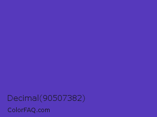 Decimal 90507382 Color is a normal indigo color and the nearest color is Ocean Blue #4f42b5. Hex code #5639bc and RGB value is rgb(86,57,188). In RGB color space, this color is composed of 34% red, 22% green, 74% blue, In CMYK color space, this color is composed of 54% cyan, 70% magenta, 0% yellow , 26% black , In HSL color space, this color has a hue angle of 253° , 53% saturation and 48% lightness.
