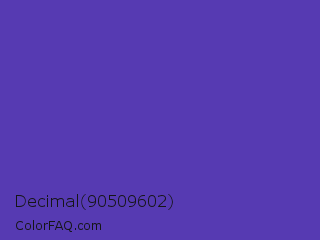 Decimal 90509602 Color is a normal indigo color and the nearest color is Ocean Blue #4f42b5. Hex code #563ab2 and RGB value is rgb(86,58,178). In RGB color space, this color is composed of 34% red, 23% green, 70% blue, In CMYK color space, this color is composed of 52% cyan, 67% magenta, 0% yellow , 30% black , In HSL color space, this color has a hue angle of 254° , 51% saturation and 46% lightness.