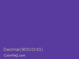 Decimal 90510165 Color is a normal indigo color and the nearest color is Gigas #523c94. Hex code #563b9b and RGB value is rgb(86,59,155). In RGB color space, this color is composed of 34% red, 23% green, 61% blue, In CMYK color space, this color is composed of 45% cyan, 62% magenta, 0% yellow , 39% black , In HSL color space, this color has a hue angle of 257° , 45% saturation and 42% lightness.