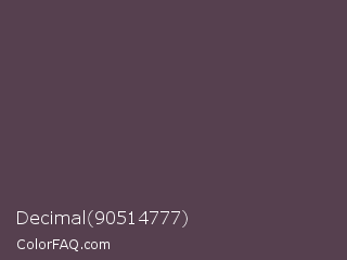 Decimal 90514777 Color is a dark magenta color and the nearest color is Purple Taupe #50404d. Hex code #56404f and RGB value is rgb(86,64,79). In RGB color space, this color is composed of 34% red, 25% green, 31% blue, In CMYK color space, this color is composed of 0% cyan, 26% magenta, 8% yellow , 66% black , In HSL color space, this color has a hue angle of 319° , 15% saturation and 29% lightness.