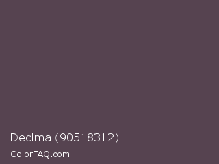 Decimal 90518312 Color is a dark magenta color and the nearest color is Mortar #504351. Hex code #564350 and RGB value is rgb(86,67,80). In RGB color space, this color is composed of 34% red, 26% green, 31% blue, In CMYK color space, this color is composed of 0% cyan, 22% magenta, 7% yellow , 66% black , In HSL color space, this color has a hue angle of 319° , 12% saturation and 30% lightness.