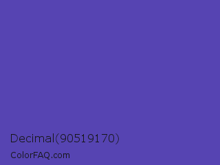 Decimal 90519170 Color is a normal indigo color and the nearest color is Plump Purple #5946b2. Hex code #5644b2 and RGB value is rgb(86,68,178). In RGB color space, this color is composed of 34% red, 27% green, 70% blue, In CMYK color space, this color is composed of 52% cyan, 62% magenta, 0% yellow , 30% black , In HSL color space, this color has a hue angle of 250° , 45% saturation and 48% lightness.