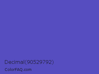 Decimal 90529792 Color is a normal indigo color and the nearest color is Iris #5a4fcf. Hex code #564dc0 and RGB value is rgb(86,77,192). In RGB color space, this color is composed of 34% red, 30% green, 75% blue, In CMYK color space, this color is composed of 55% cyan, 60% magenta, 0% yellow , 25% black , In HSL color space, this color has a hue angle of 245° , 48% saturation and 53% lightness.