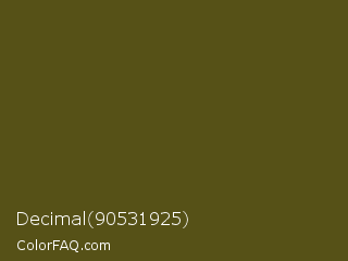 Decimal 90531925 Color is a very dark yellow color and the nearest color is West Coast #625119. Hex code #565117 and RGB value is rgb(86,81,23). In RGB color space, this color is composed of 34% red, 32% green, 9% blue, In CMYK color space, this color is composed of 0% cyan, 6% magenta, 73% yellow , 66% black , In HSL color space, this color has a hue angle of 55° , 58% saturation and 21% lightness.