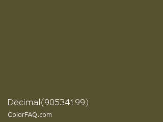 Decimal 90534199 Color is a dark yellow color and the nearest color is Woodland #4d5328. Hex code #565231 and RGB value is rgb(86,82,49). In RGB color space, this color is composed of 34% red, 32% green, 19% blue, In CMYK color space, this color is composed of 0% cyan, 5% magenta, 43% yellow , 66% black , In HSL color space, this color has a hue angle of 54° , 27% saturation and 26% lightness.