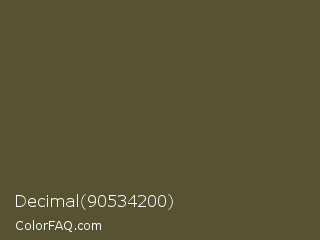 Decimal 90534200 Color is a dark yellow color and the nearest color is Woodland #4d5328. Hex code #565232 and RGB value is rgb(86,82,50). In RGB color space, this color is composed of 34% red, 32% green, 20% blue, In CMYK color space, this color is composed of 0% cyan, 5% magenta, 42% yellow , 66% black , In HSL color space, this color has a hue angle of 53° , 26% saturation and 27% lightness.