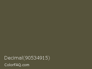 Decimal 90534915 Color is a dark yellow color and the nearest color is Hemlock #5e5d3b. Hex code #56533b and RGB value is rgb(86,83,59). In RGB color space, this color is composed of 34% red, 33% green, 23% blue, In CMYK color space, this color is composed of 0% cyan, 3% magenta, 31% yellow , 66% black , In HSL color space, this color has a hue angle of 53° , 19% saturation and 28% lightness.