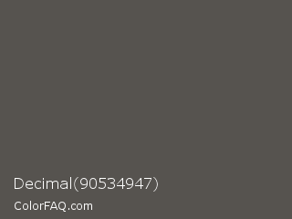 Decimal 90534947 Color is a normal orange color and the nearest color is Fuscous Gray #54534d. Hex code #56534f and RGB value is rgb(86,83,79). In RGB color space, this color is composed of 34% red, 33% green, 31% blue, In CMYK color space, this color is composed of 0% cyan, 3% magenta, 8% yellow , 66% black , In HSL color space, this color has a hue angle of 34° , 4% saturation and 32% lightness.