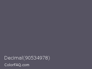 Decimal 90534978 Color is a normal indigo color and the nearest color is Scarpa Flow #585562. Hex code #565362 and RGB value is rgb(86,83,98). In RGB color space, this color is composed of 34% red, 33% green, 38% blue, In CMYK color space, this color is composed of 12% cyan, 15% magenta, 0% yellow , 62% black , In HSL color space, this color has a hue angle of 252° , 8% saturation and 35% lightness.