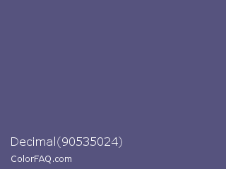 Decimal 90535024 Color is a normal indigo color and the nearest color is Purple Navy #4e5180. Hex code #56537e and RGB value is rgb(86,83,126). In RGB color space, this color is composed of 34% red, 33% green, 49% blue, In CMYK color space, this color is composed of 32% cyan, 34% magenta, 0% yellow , 51% black , In HSL color space, this color has a hue angle of 244° , 21% saturation and 41% lightness.