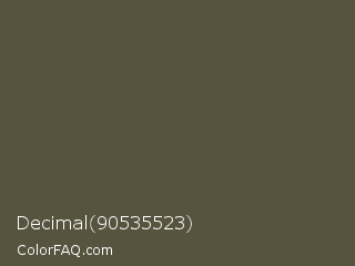 Decimal 90535523 Color is a dark yellow color and the nearest color is Hemlock #5e5d3b. Hex code #56543f and RGB value is rgb(86,84,63). In RGB color space, this color is composed of 34% red, 33% green, 25% blue, In CMYK color space, this color is composed of 0% cyan, 2% magenta, 27% yellow , 66% black , In HSL color space, this color has a hue angle of 55° , 15% saturation and 29% lightness.