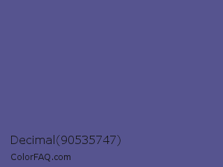 Decimal 90535747 Color is a normal indigo color and the nearest color is Victoria #534491. Hex code #56548f and RGB value is rgb(86,84,143). In RGB color space, this color is composed of 34% red, 33% green, 56% blue, In CMYK color space, this color is composed of 40% cyan, 41% magenta, 0% yellow , 44% black , In HSL color space, this color has a hue angle of 242° , 26% saturation and 45% lightness.