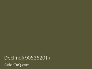 Decimal 90536201 Color is a dark yellow color and the nearest color is Verdigris #5d5e37. Hex code #565535 and RGB value is rgb(86,85,53). In RGB color space, this color is composed of 34% red, 33% green, 21% blue, In CMYK color space, this color is composed of 0% cyan, 1% magenta, 38% yellow , 66% black , In HSL color space, this color has a hue angle of 58° , 24% saturation and 27% lightness.